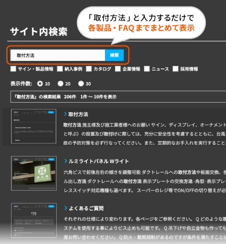 「取付方法」などこれまで見つけにくかった情報も、キーワード入力で迷わずアクセスできます。