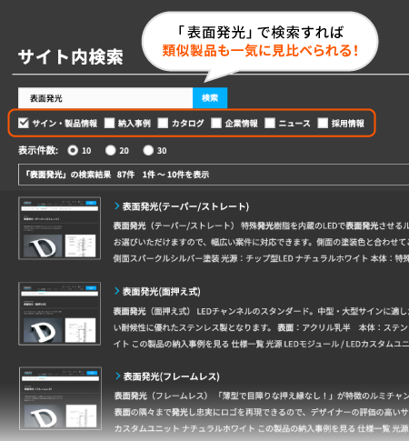 また、チェックボックスで検索条件を選ぶと、目的にあった情報に絞り込めるので、類似製品が見やすく、比較検討もスムーズです。
