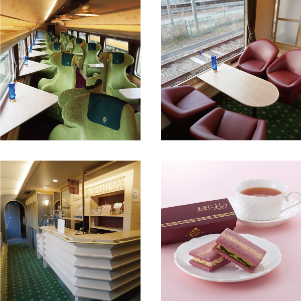 正倉院の宝物をモチーフにした天平文様が溢れる車内は、乗った瞬間から奈良の歴史・文化を感じられます。地下鉄なんば駅から京都駅まで乗り換えありで、1時間ほどかかります。ですが、あをによしは乗り換えなしで難波から京都まで1時間20分かかります。時間がかかる分、移動時間を優雅なくつろぎの時間にしようということになりました。
